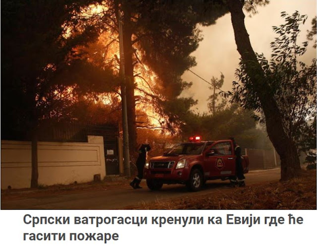 Με εντολή του Προέδρου της Δημοκρατίας της Σερβίας, Αλεξάνταρ Βούτσιτς, ο Υπουργός Εσωτερικών, Αλεξάνταρ Βουλίν, συμφώνησε με τον Υπουργό Πολιτικής Προστασίας της Δημοκρατίας της Ελλάδας, Μιχάλη Χρυσοχοΐδη, να παράσχουν βοήθεια σε συναδέλφους και πληθυσμό αυτής της χώρας λόγω των μεγάλων πυρκαγιών.