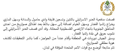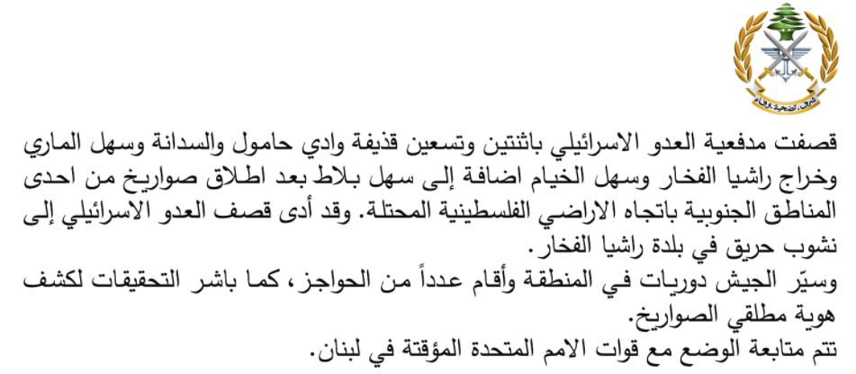 Η ανακοίνωση του λιβανικού στρατού δημοσιεύθηκε στην επίσημη ιστοσελίδα στο Twitter, όπου αναφέρεται ότι ο βομβαρδισμός προκάλεσε πυρκαγιά στο χωριό Ρατσάγια αλ Φουχάρ στην περιοχή Χασμπάγια.