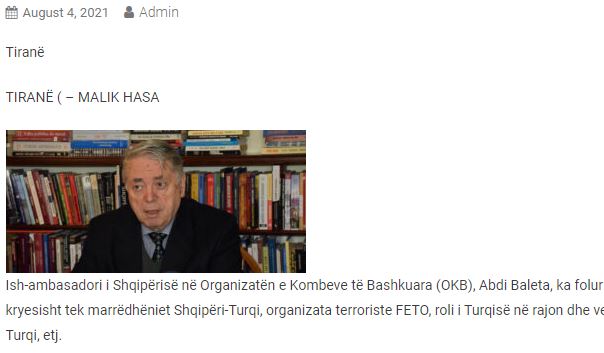 Ενώ σήμανε συναγερμός ότι μπορούν να χρησιμοποιηθούν από διάφορους αντιτουρκικούς κύκλους στην Αλβανία, όπως η Ελλάδα, σύμφωνα με τον ίδιο, που εργάζεται για να διαταράξει τις σχέσεις Τουρκίας-Αλβανίας. Προσθέτοντας ότι ασχολούνται επίσης με μυστικές εργασίες στην Αλβανία, ο Μπαλέτα λέει ότι τα ιδρύματα θα πρέπει να διεξάγουν ελέγχους για να αποτρέψουν την παρουσία εισαγωγής στα σχολεία που λειτουργούν στην Αλβανία.