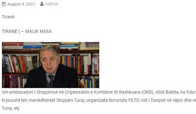 Ο πρώην πρέσβης της Αλβανίας στα Ηνωμένα Έθνη (ΟΗΕ), Αμπντί Μπαλέτα, μίλησε για διάφορα θέματα, εστιάζοντας κυρίως στις σχέσεις Αλβανίας-Τουρκίας, την τρομοκρατική οργάνωση FETO, τον ρόλο της Τουρκίας στην περιοχή και ιδιαίτερα στην Αλβανία, τις εξελίξεις στην Τουρκία κ.λπ.