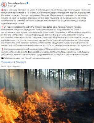 Όταν η Βουλγαρία βοηθάει τη Βόρεια Μακεδονία βοηθά στην αντιμετώπιση των πυρκαγιών, βοηθά όχι μόνο τη γειτονική χώρα, αλλά υποστηρίζει και τους συμπατριώτες της και εμποδίζει τη φωτιά να εισέλθει στα σύνορά μας», έγραψε ο Τζαμπάσκι χαρακτηριστικά στα μέσα κοινωνικής δικτύωσης.