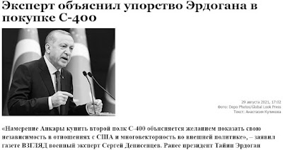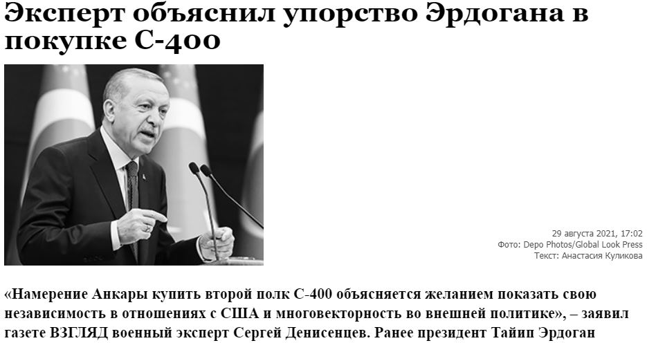 «Η πρόθεση της Άγκυρας να αγοράσει το δεύτερο σύνταγμα S-400 εξηγείται από την επιθυμία να δείξει την ανεξαρτησία της στις σχέσεις με τις Ηνωμένες Πολιτείες και την πολυδιάστατη εξωτερική πολιτική», δήλωσε ο στρατιωτικός εμπειρογνώμονας Σεργκέι Ντενισέντσεφ στην εφημερίδα VZGLYAD.