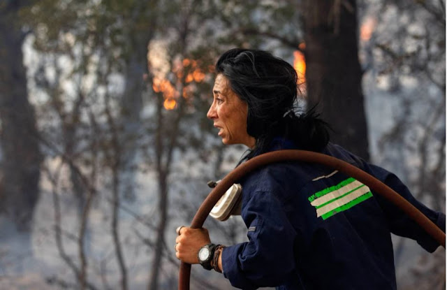 Φωτογραφίες μιας γενναίας γυναίκας της οποίας το πρόσωπο δείχνει όλη τη φρίκη που περνούν οι πυροσβέστες έχουν εμφανιστεί σχεδόν σε όλα τα μέσα ενημέρωσης στην Ελλάδα, γράφει η Βέτσερ των Σκοπίων.