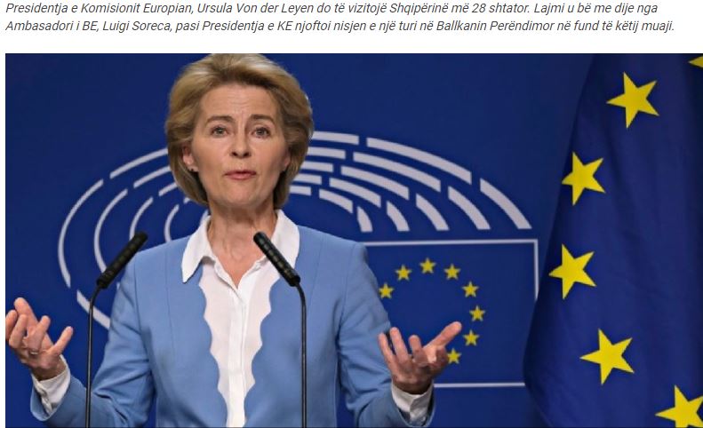 Η Πρόεδρος της Ευρωπαϊκής Επιτροπής, Ούρσουλα Φον ντερ Λάιεν, θα επισκεφθεί την Αλβανία στις 28 Σεπτεμβρίου. Η είδηση ανακοινώθηκε από τον Πρέσβη της ΕΕ Λουίτζι Σορέκα αφού η Πρόεδρος της Ευρωπαϊκής Επιτροπής ανακοίνωσε την έναρξη περιοδείας στα Δυτικά Βαλκάνια αργότερα αυτόν τον μήνα.