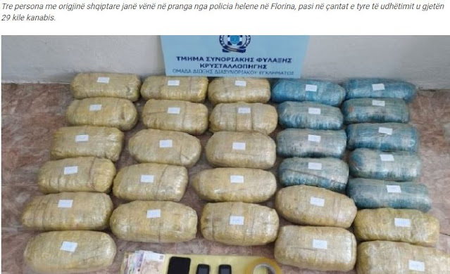 Τρία άτομα αλβανικής καταγωγής συνελήφθησαν από την Ελληνική Αστυνομία στη Φλώρινα, αφού βρέθηκαν 29 κιλά κάνναβης στις ταξιδιωτικές τσάντες τους.