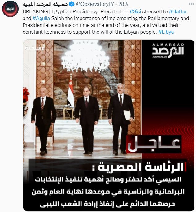 Ο Σίσι συζήτησε με τον στρατάρχη Χάφταρ και τον πρόεδρο της Βουλής των Αντιπροσώπων τις εξελίξεις στην πολιτική και την ασφάλεια στη Λιβύη, καθώς και τις επικείμενες εκλογές στη Λιβύη που έχουν προγραμματιστεί να πραγματοποιηθούν στις 24 Δεκεμβρίου, ειδικά με την ολοκλήρωση από τη Βουλή των Αντιπροσώπων του προεδρικού εκλογικού νόμου.