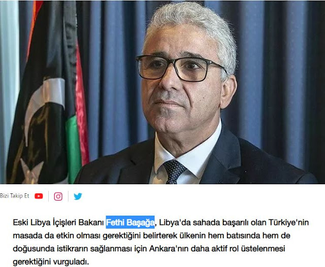 Ο πρώην υπουργός Εσωτερικών της Λιβύης Φάθι Μπασάγκα, δήλωσε ότι η Τουρκία, η οποία είναι επιτυχής στο πεδίο της Λιβύης, θα πρέπει επίσης να είναι ενεργή στο τραπέζι των διαπραγματεύσεων και τόνισε ότι η Άγκυρα πρέπει να αναλάβει έναν πιο ενεργό ρόλο προκειμένου να εξασφαλίσει σταθερότητα τόσο στα δυτικά όσο και στα ανατολικά της χώρας.