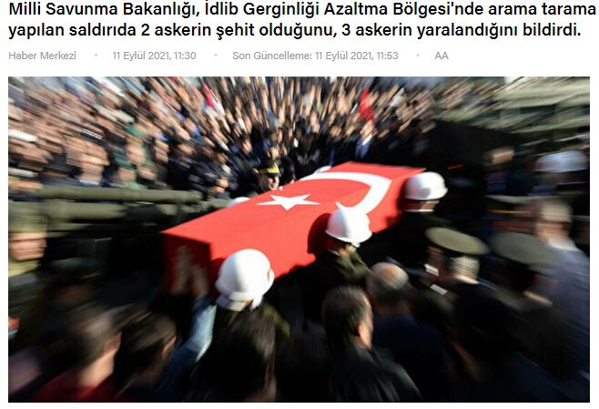 «Στη ζώνη αποκλιμάκωσης του Ιντλίμπ στις 11 Σεπτεμβρίου 2021, κατά τη διάρκεια δραστηριοτήτων έρευνας και σάρωσης, από επίθεση στις μονάδες μας, δύο από τους στρατιώτες μας σκοτώθηκαν», γράφει η τουρκική εφημερίδα Γενί Σαφάκ.