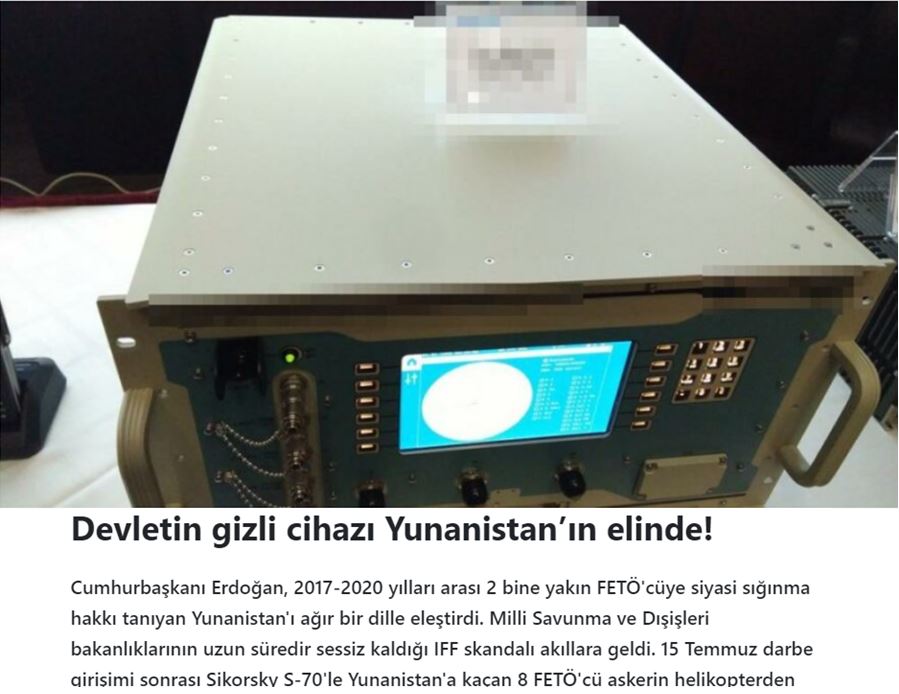 Μετά την απόπειρα πραξικοπήματος της 15ης Ιουλίου, το IFF (Σύστημα Αναγνώρισης Φίλων και Εχθρών) και οι συσκευές νυχτερινής όρασης, οι οποίες αποσυναρμολογήθηκαν από το ελικόπτερο από 8 στρατιώτες του FETO που κατέφυγαν στην Ελλάδα με το Sikorsky S-70, βρίσκονται ακόμη στα χέρια των ελληνικών μυστικών υπηρεσιών! Ο καθένας από τους 8 στρατιώτες αναζητείται με ανταμοιβή 10 εκατομμύρια TL (τουρκικές λίρες) ...