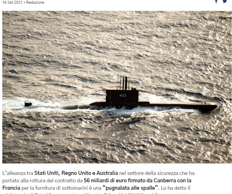 Η συμμαχία μεταξύ των Ηνωμένων Πολιτειών, του Ηνωμένου Βασιλείου και της Αυστραλίας στον τομέα της ασφάλειας που οδήγησε στο σπάσιμο της σύμβασης 56 δισ. Ευρώ που υπέγραψε η Καμπέρα με τη Γαλλία για την προμήθεια υποβρυχίων είναι ένα «μαχαίρι στην πλάτη».