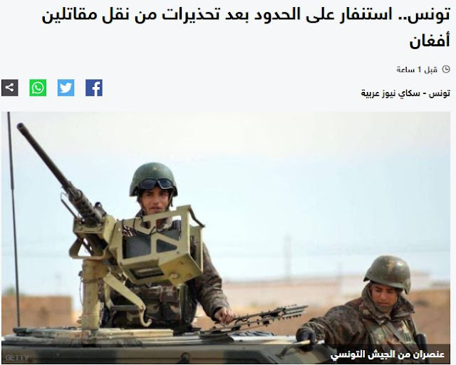 Αρκετές πηγές ασφαλείας της Τυνησίας προειδοποίησαν για σχέδια εισβολής Αφγανών μισθοφόρων και μαχητών στα σύνορα από γειτονικές χώρες, με αποτέλεσμα οι αρχές να ανεβάσουν το μέγιστο επίπεδο συναγερμού σε όλα τα σύνορα, σύμφωνα με την τοπική εφημερίδα Al-Sabah.