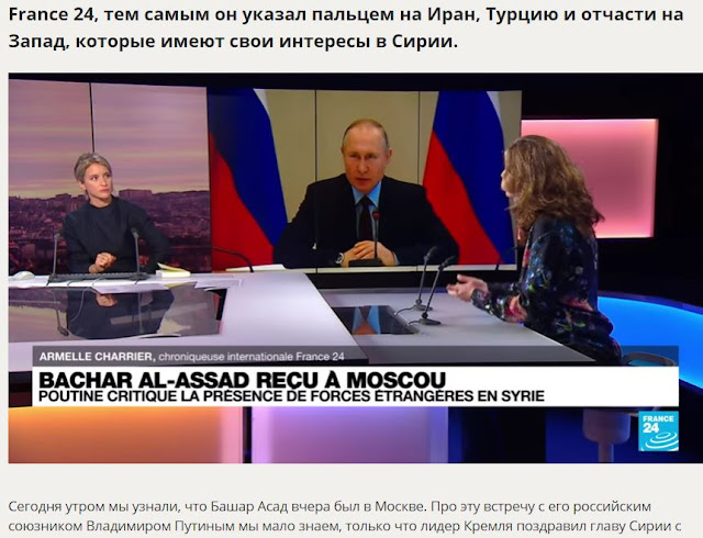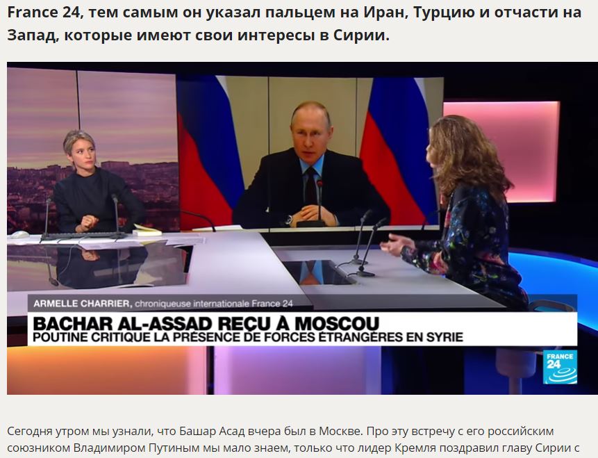 Σύμφωνα με τον παρατηρητή του France 24, με αυτόν τον τρόπο έδειξε το δάχτυλο προς το Ιράν, την Τουρκία και εν μέρει προς τη Δύση, που έχουν τα δικά τους συμφέροντα στη Συρία.