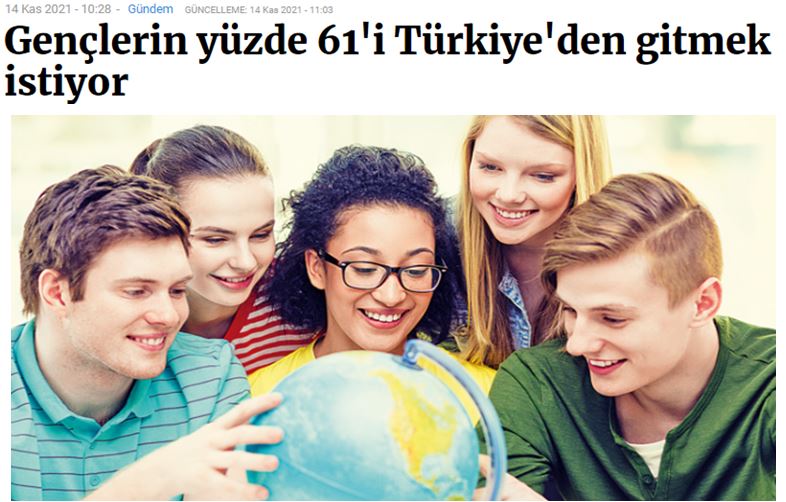Η «Istanbul Economics Research» πραγματοποίησε μια μελέτη σε νέους ηλικίας 18-30 ετών. Σύμφωνα με τη μελέτη, το 61 τοις εκατό των νέων δήλωσε ότι θα προτιμούσε να «μεταναστεύσει για μια καλύτερη ζωή».