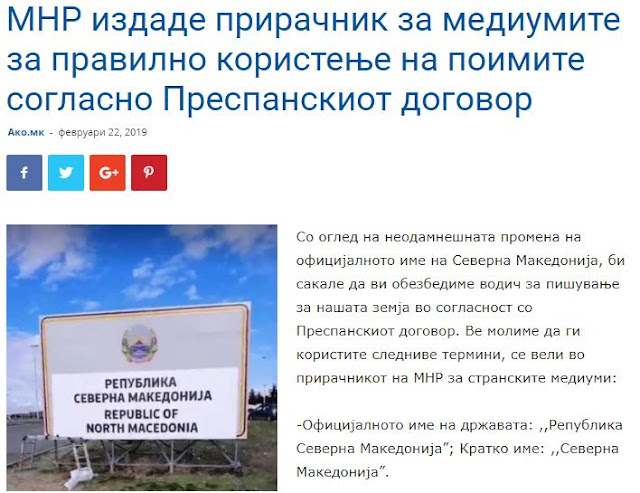 Δεδομένης της πρόσφατης αλλαγής της επίσημης ονομασίας της Βόρειας Μακεδονίας, θα θέλαμε να σας προσφέρουμε έναν οδηγό γραφής για τη χώρα μας, σύμφωνα με τη Συμφωνία των Πρεσπών, γράφει το σλαβικό δημοσίευμα των Σκοπίων.