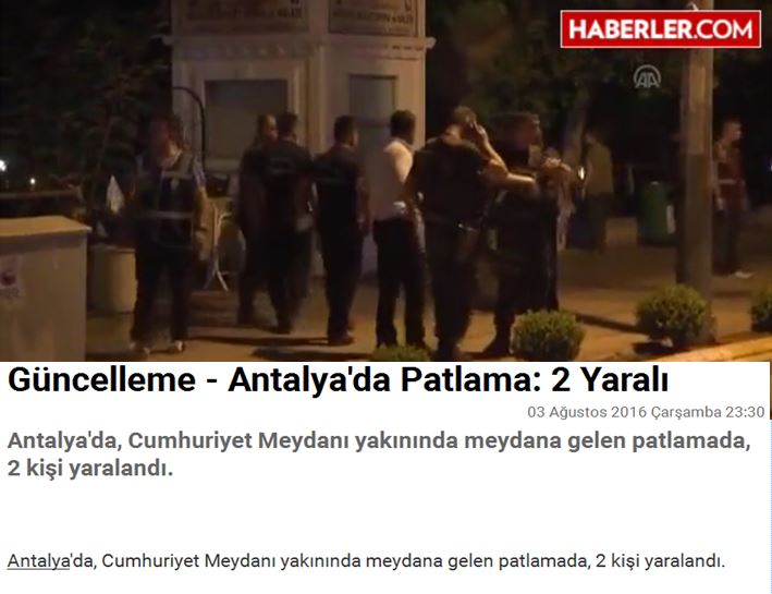 Δύο άτομα τραυματίσθηκαν σε μια έκρηξη στην πλατεία Δημοκρατίας στην τουρκική πόλη Αττάλεια, ανέφεραν τα τοπικά μέσα ενημέρωσης.