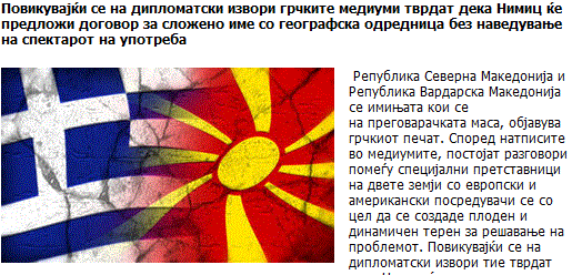 «Ο πρωθυπουργός των Σκοπίων θεωρεί ότι είναι πλέον καιρός να λυθεί το πρόβλημα με την Ελλάδα για το συνταγματικό όνομα της πΓΔΜ, αλλά, όπως είπε, θεωρεί ότι οι απαιτήσεις του νότιου γείτονα είναι μαξιμαλιστικές» γράφουν τα σκοπιανά μέσα ενημέρωσης.