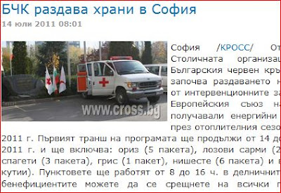 Η βουλγαρική οργάνωση του Ερυθρού Σταυρού ξεκίνησε τη διανομή τροφίμων σήμερα στο κέντρο της βουλγαρικής πρωτεύουσας από αποθέματα τα οποία εστάλησαν από την Ευρωπαϊκή Ένωση και δικαίωμα παραλαβής της ενίσχυσης αυτής έχουν τα άτομα τα οποία έλαβαν ενίσχυση για τη θέρμανση την περίοδο 2010-2011.