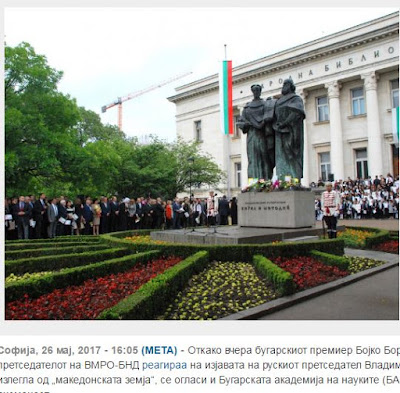 Μετά τις αντιδράσεις που σημειώθηκαν χθες από τον πρωθυπουργό της Βουλγαρίας, Μπόικο Μπορίσοφ, από τον ιστορικό Μπόζινταρ Ντιμιτρόφ καθώς και τον πρόεδρο του κόμματος VMRO-BND, Κρασιμίρ Καρακατσάνοφ, για τις δηλώσεις του Ρώσου προέδρου, ότι το σλαβικό αλφάβητο εισήχθη από τα εδάφη των Σκοπίων, η Βουλγαρική Ακαδημία Επιστημών (БАН) έδωσε τη δική της ερμηνεία για το σλαβικό αλφάβητο, σημειώνει το σκοπιανό ‘Meta.mk’.