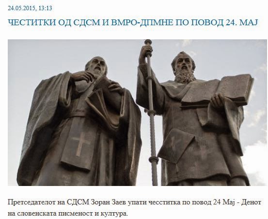 Γιορτάστηκε σήμερα σε όλο το Σλαβικό Κόσμο η Ημέρα του Σλαβικού Πολιτισμού. Με την ευκαιρία της Μεγάλης Γιορτής, ο αρχηγός του Σοσιαλδημοκρατικού κόμματος- SDSM, Ζόραν Ζάεφ, δήλωσε ότι η σημερινή γιορτή, η 24η Μαΐου είναι η Ημέρα των διαφωτιστών αδελφών Κυρίλλου και Μεθοδίου που με τη συμβολή τους και τον ιστορικό τους ρόλο, έδωσαν στο σλαβικό λαό τα γράμματα και την ενοποίηση των Σλάβων.