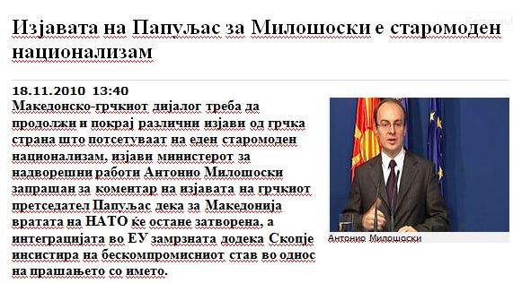« Ο ελληνικό-σκοπιανός διάλογος πρέπει να συνεχιστεί παρά τις διάφορες δηλώσεις από την ελληνική πλευρά που ομοιάζουν με παλιομοδίτικο εθνικισμό» δήλωσε ο υπουργός Εξωτερικών της Βαρντάρσκας, Αντόνιο Μιλοσόσκι, όταν του ζητήθηκε να σχολιάσει τη δήλωση του Έλληνα Προέδρου ότι οι πόρτες του ΝΑΤΟ και της ΕΕ, θα παραμείνουν κλειστές αν δεν επιλυθεί το θέμα της ονομασίας των Σκοπίων.