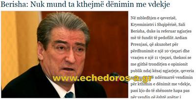Κατά τη συνεδρίαση της κυβέρνησης, ο πρωθυπουργός της Αλβανίας, Σαλί Μπερίσα, αναφερόμενος στην πιο πρόσφατη περίπτωση παιδεραστίας του Ardian Prrenjas, ο οποίος βίασε ένα 10χρονο παιδί και δολοφόνησε ένα 11χρονο, δήλωσε ότι παρά το σοκ του λαού από αυτό το γεγονός, η κυβέρνηση δεν μπορεί να λάβει απόφαση σχετικά με την επιστροφή της θανατικής ποινής.