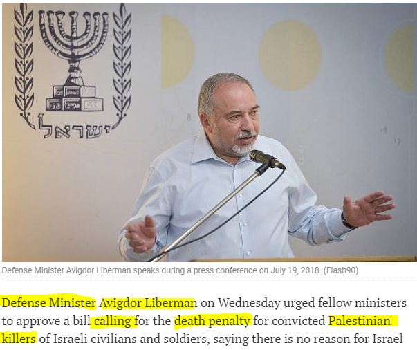 Ο υπουργός Άμυνας του Ισραήλ, Αβιγκντόρ Λίμπερμαν, προέτρεψε την Τετάρτη τους συναδέλφους υπουργούς να εγκρίνουν νομοσχέδιο που επιβάλει τη θανατική ποινή για καταδικασθέντες παλαιστίνιους δολοφόνους ισραηλινών πολιτών και στρατιωτών, λέγοντας ότι δεν υπάρχει λόγος για το Ισραήλ να είναι περισσότερο διαφωτισμένο από τις ΗΠΑ στον πόλεμο κατά της τρομοκρατίας.