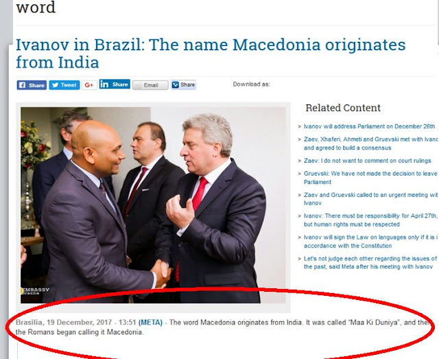 Ο πρόεδρος των Σκοπίων, Γκεόργκι Ιβάνοφ, πιστεύει ότι η λέξη ‘Μακεδονία’ προέρχεται από την Ινδία και η αρχική ονομασία της ήταν «Μαα Κι Ντουνίγια» (Maa Ki Duniya), και στη συνέχεια οι Ρωμαίοι την αποκάλεσαν ‘Μακεδονία’, γράφει το σλαβικό δημοσίευμα των Σκοπίων.