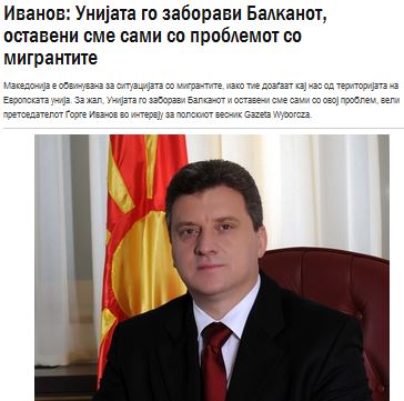 Έντονη δυσαρέσκεια υπάρχει στα Σκόπια, όπως την εξέφρασε ο πρόεδρος Γκιόργκι Ιβάνοφ, με την κατάσταση που έχει δημιουργηθεί με τους μετανάστες, και αυτή προέρχεται από τη στάση της Ευρωπαϊκής Ένωσης προς την πΓΔΜ, για τα χρήματα που διαθέτει στην κυβέρνηση των Σκοπίων για τη διέλευση των μεταναστών.