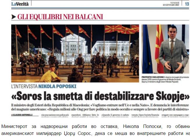 Ο απερχόμενος υπουργός Εξωτερικών, Νίκολα Ποπόσκι, κατηγόρησε τον Αμερικανό δισεκατομμυριούχο, Τζορτζ Σόρος, ότι παρεμβαίνει στις εσωτερικές υποθέσεις του νότιου σλαβικού κράτους των Σκοπίων και ότι προσπαθεί να αποσταθεροποιήσει τη χώρα.
